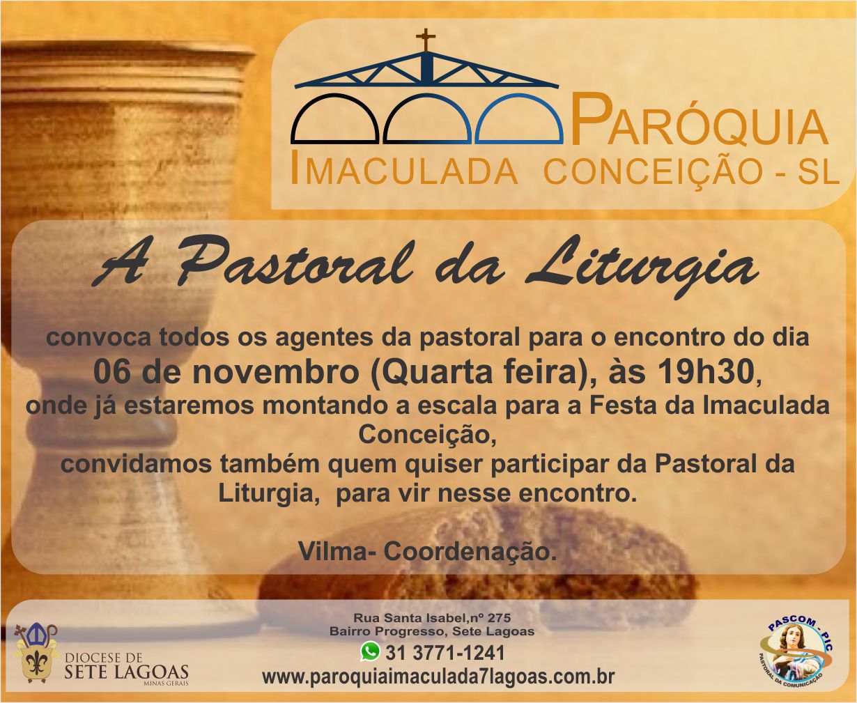 convoca todos os agentes da pastoral para o encontro do dia 06 de novembro ( Quarta feira), às 19h30, onde já estaremos montando a escala para a Festa da Imaculada Conceição , convidamos também quem quiser participar da Pastoral da Liturgia, para vir nesse encontro.